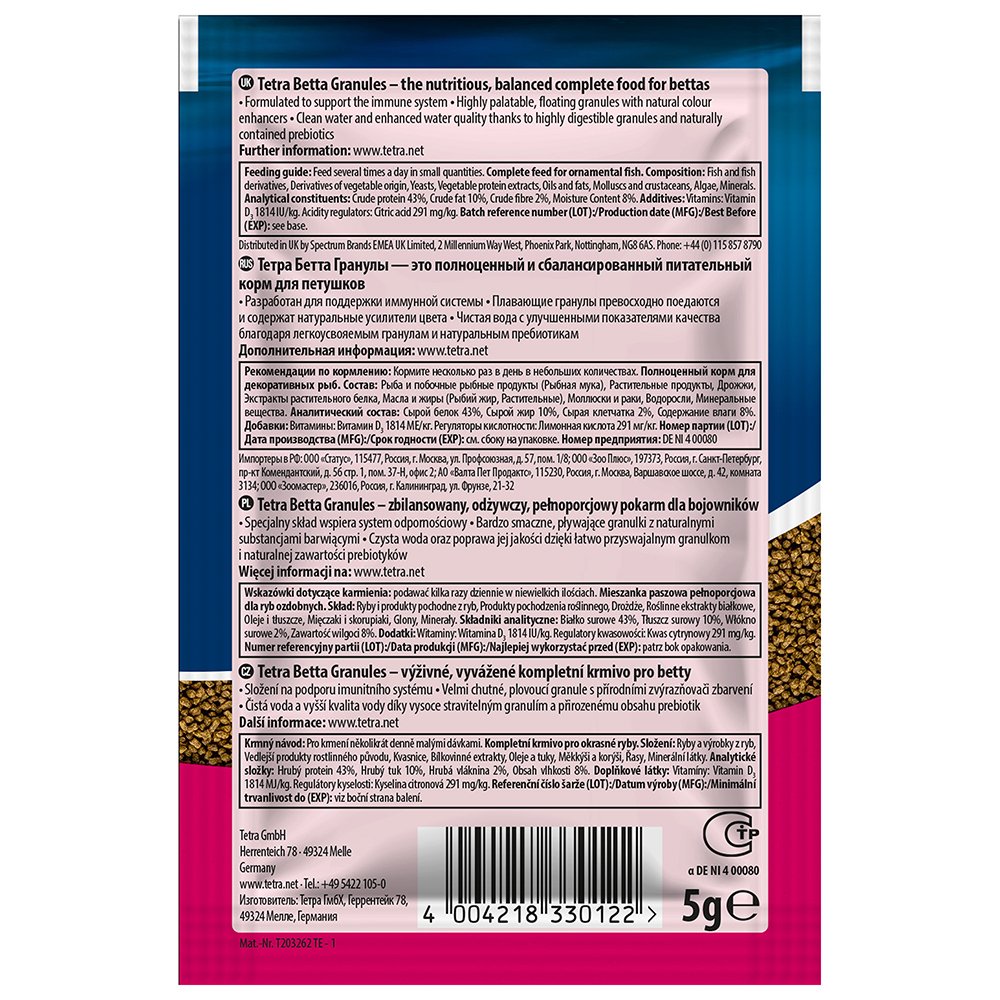 Tetra Betta Granules is a nutritious balanced granular food providing a complete diet for daily feeding of all bettas. The highly palatable, floating granules include natural colour enhancers and are formulate to support the immune system of bettas. The food contains prebiotics that supportĀ the bodily functions of fish and food conversion. This ensures healthy fish growth, vitality and colour vibrancy, and contributes to enhanced water quality. The unique recipe, which is with high-quality natural ingredients, without colourants and added preservatives, promotes optimal growth and increased resilience. With Tetra Betta Granules, your betta will thrive, and it helps to keep your aquarium water clean and clear.