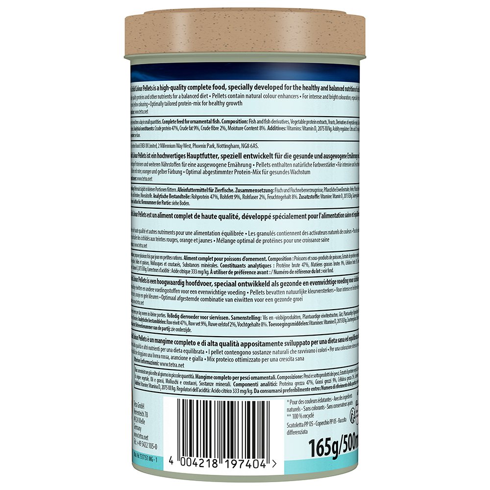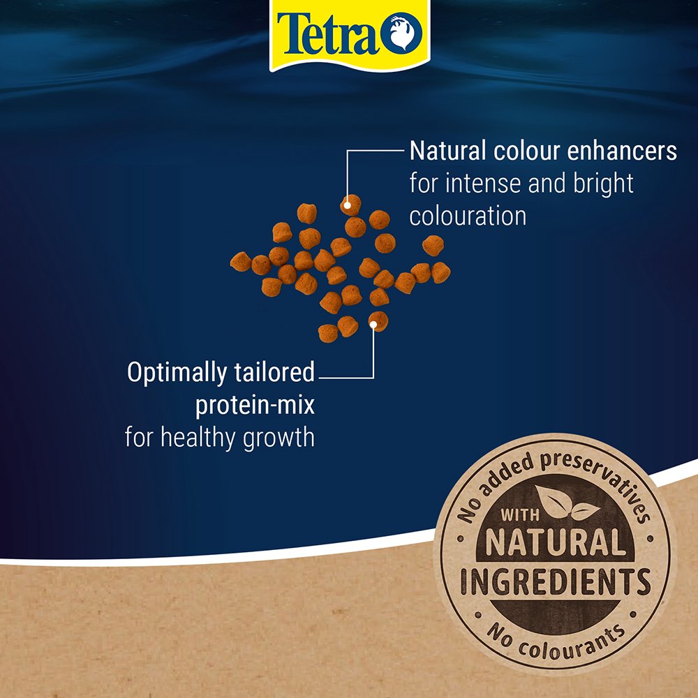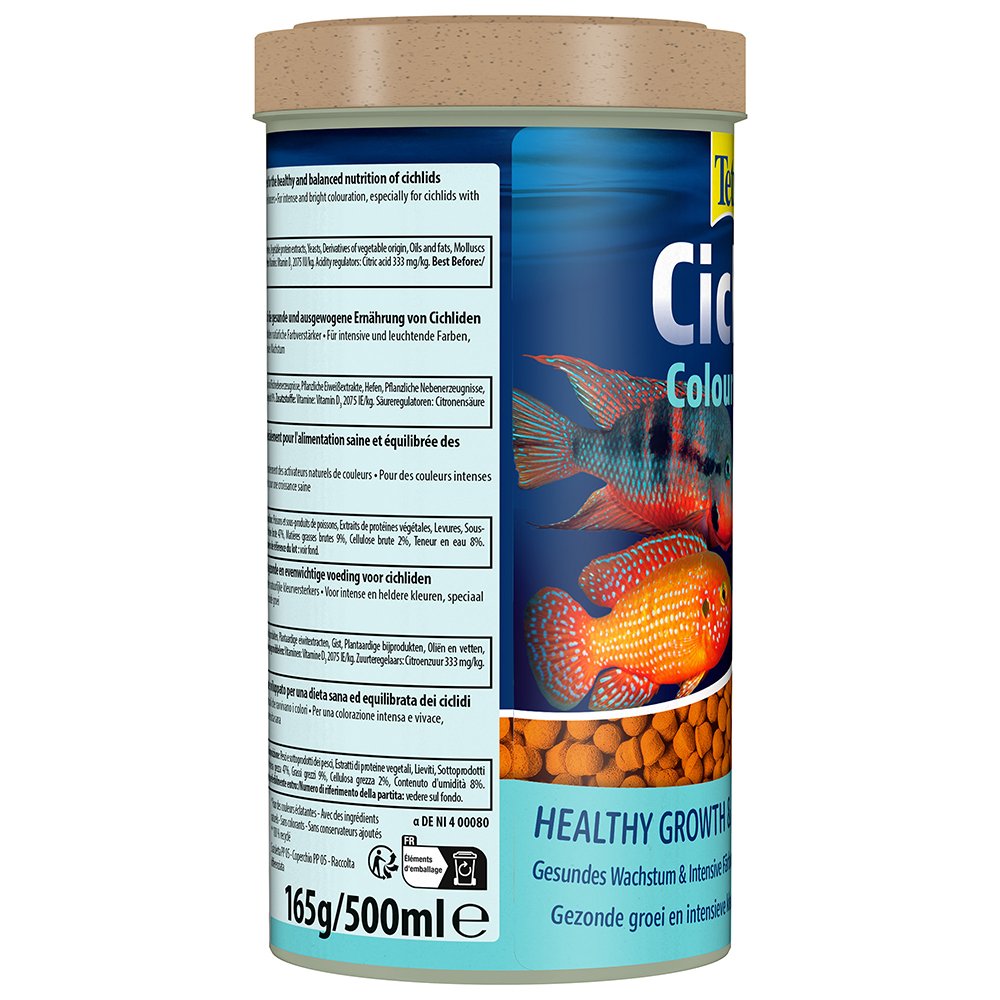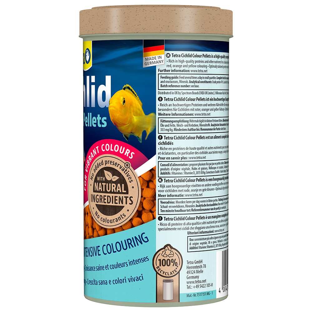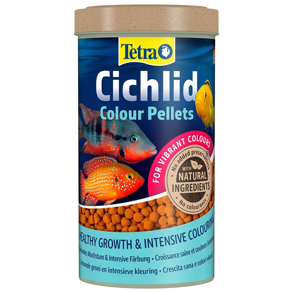 Tetra Cichlid Colour Pellets is a high-quality complete food, specially developed for the healthy and balanced nutrition of cichlids. It is rich in high-quality proteins and other nutrients to meet the nutritional needs of cichlids. The food pellets contain natural colour enhancers for intense and bright colouration, especially for cichlids with red, orange and yellow colouring. The unique recipe, which is with high-quality natural ingredients, without colourants and added preservatives, and the optimally tailored protein-mix promote optimal growth and increased resilience. The formula supports a long and healthy life. With Tetra Colour Pellets, your cichlid will thrive, and your aquarium water will stay clean and clear.