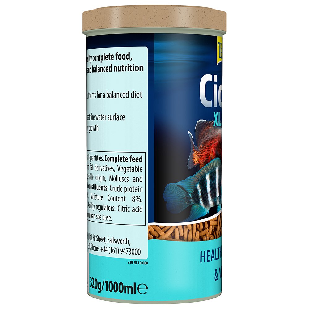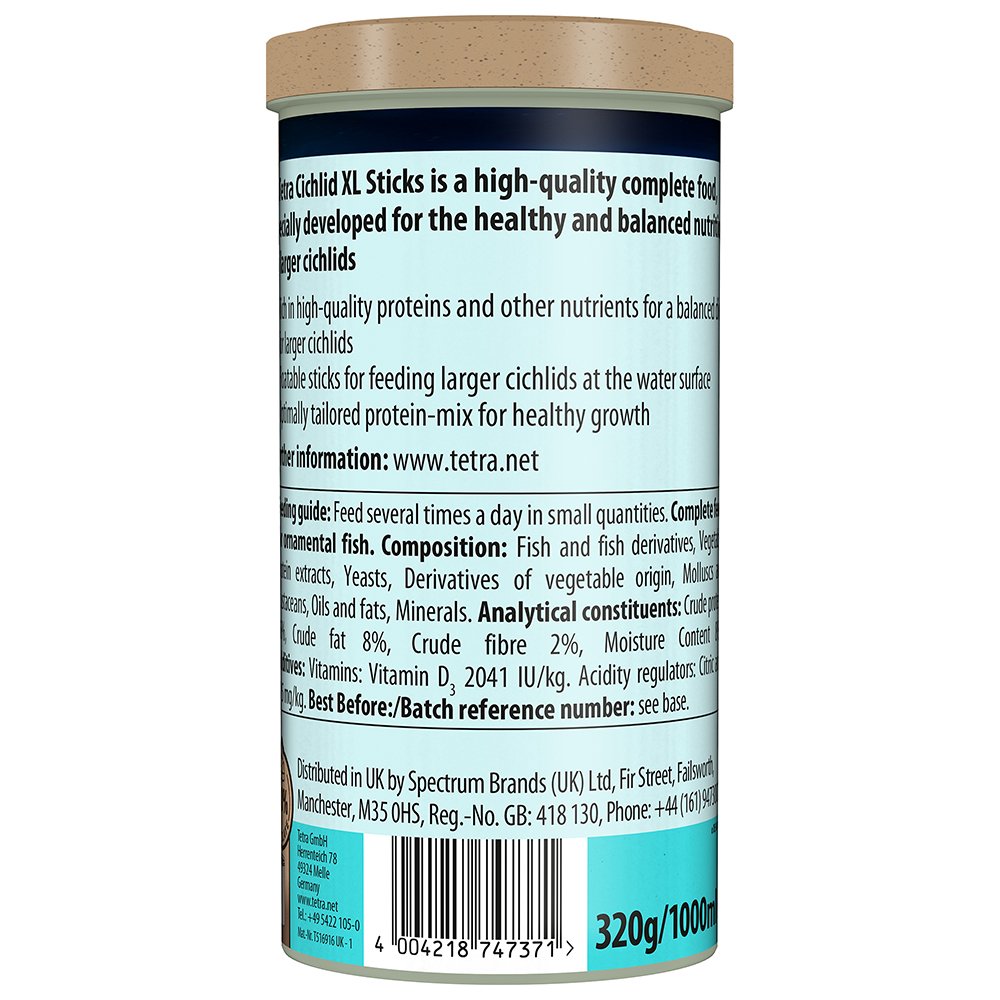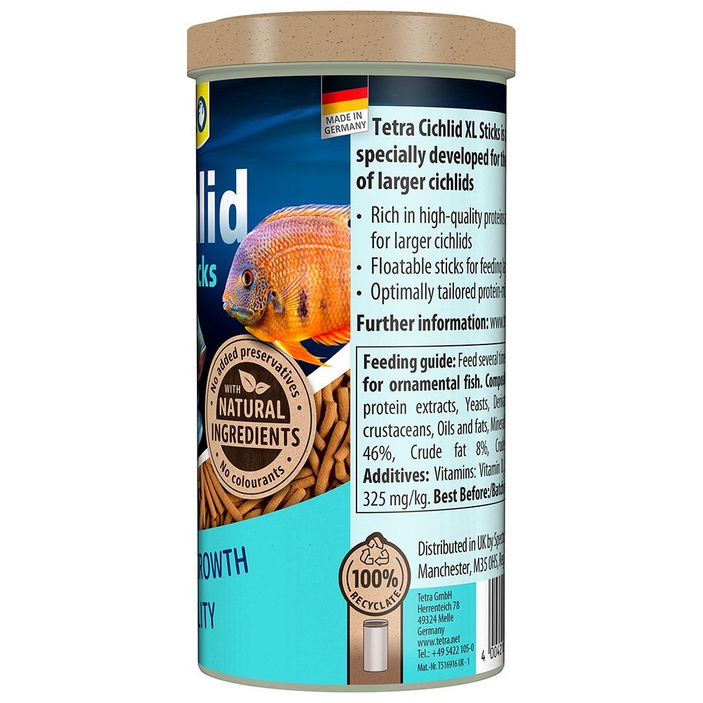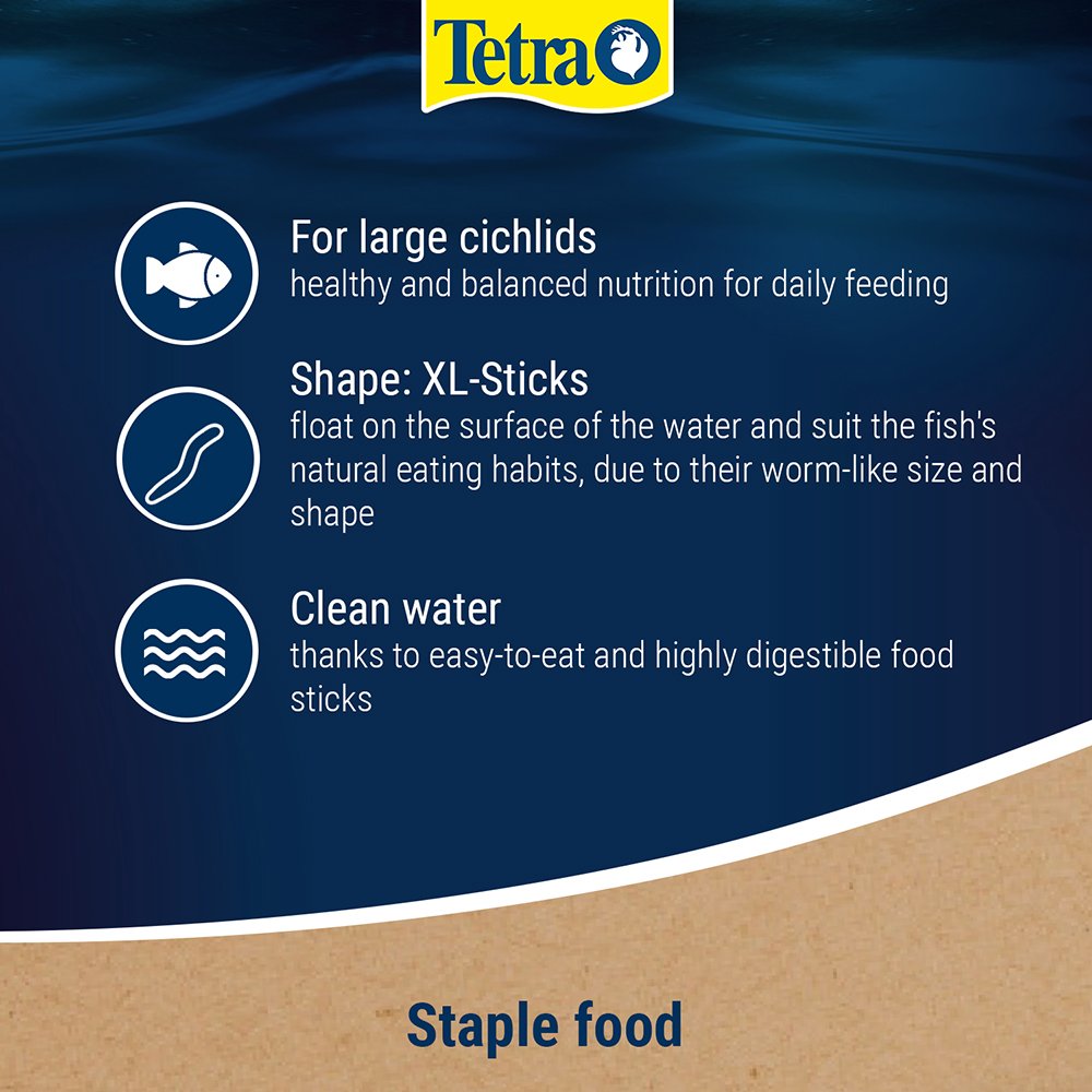 Tetra Cichlid XL Sticks is a high-quality complete food in the form of large sticks, specially developed for the healthy and balanced nutrition of larger cichlids and other ornamental fish. The nutrient content meets the cichlids’ increased requirements for animal proteins and ensures a naturally balanced nutrition. The sticks float on the surface of the water and suit the fish’s natural eating habits, due to their worm-like size and shape. The unique recipe, which is with high-quality natural ingredients, without colourants and added preservatives, and the optimally tailored protein-mix promote optimal growth and increased resilience. With Tetra Cichlid XL Sticks, your cichlid will thrive, and the feed helps to keep your aquarium water clean and clear.