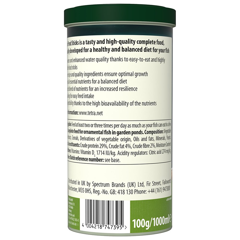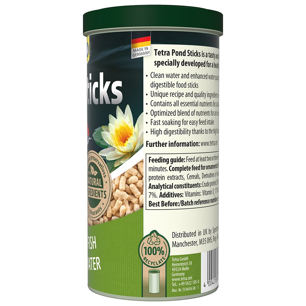 Tetra Pond Sticks provide a complete and balanced diet for daily feeding of all pond fish, promoting healthy growth, strong immune system, and enhanced water quality. The unique recipe, made with high-quality natural ingredients and without colourants and added preservatives, ensures optimal growth and increased resilience for your fish. The contained nutrients, including minerals and vitamins, are essential for a balanced diet. The fast-soaking sticks promote an easy feed intake and high digestibility, thanks to the high bioavailability of nutrients. With this unique recipe, high-quality natural ingredients, and fast-soaking formula, your pond fish will thrive, and your pond water will stay clean and clear.