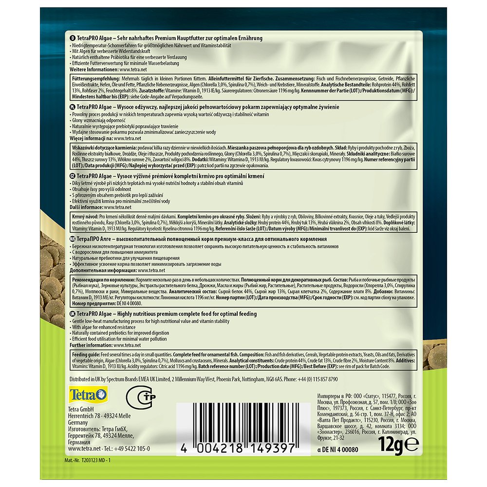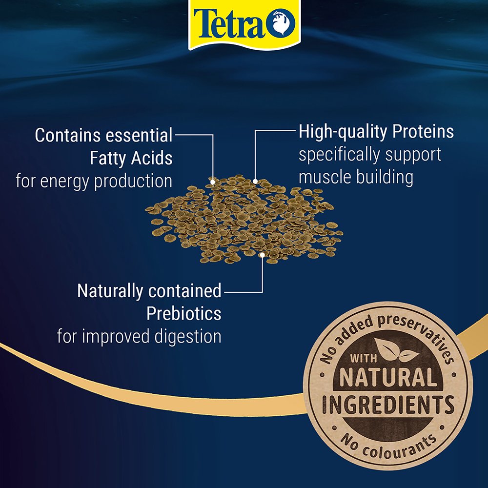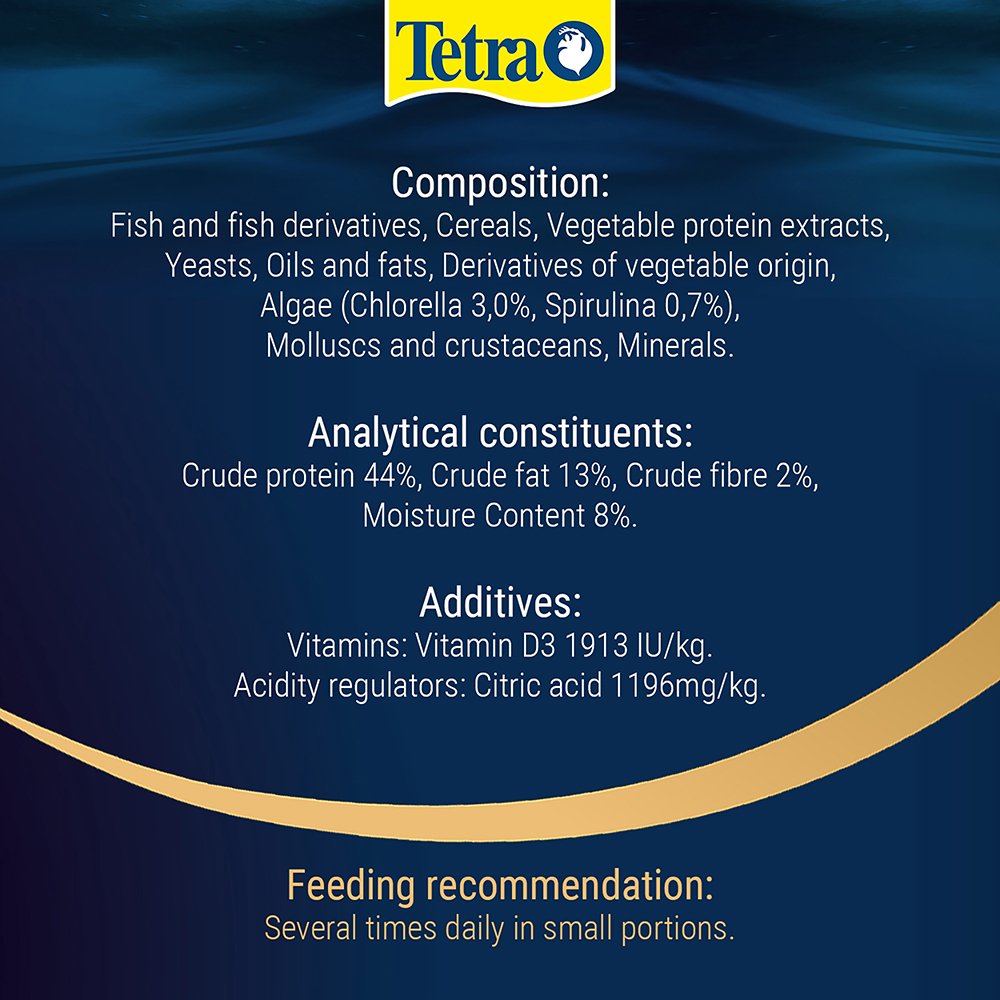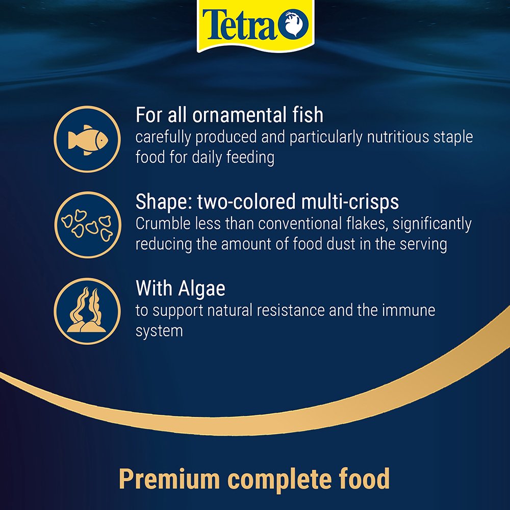 The range of TetraPRO has set a new standard in fish nutrition. The premium complete food is manufactured using a gentle, low-heat process. This special method gives TetraPRO Algae a very high nutritional value and vitamin stability. The two-coloured multi-crisps also absorb less water than normal flake food to increase the nutrient content per volume. TetraPRO Algae offers an optimised protein-fat ratio. This ensures that the fish can use the protein specifically to build muscle by providing plenty of essential fatty acids for energy generation. The algae concentrate provides your fish with everything they need to support their immune system. Tetra’s multi-crisps also crumble much less than conventional flakes, significantly reducing the amount of food dust in the tins. Furthermore, the naturally contained prebiotics specifically support growth and the metabolism of health-promoting bacteria in the intestinal tract of fish. Thanks to their palatability and high digestibility, the multi-crisps keep the water in the aquarium clean. TetraPRO Algae is formulated with high-quality ingredients and without colourants or added preservatives.