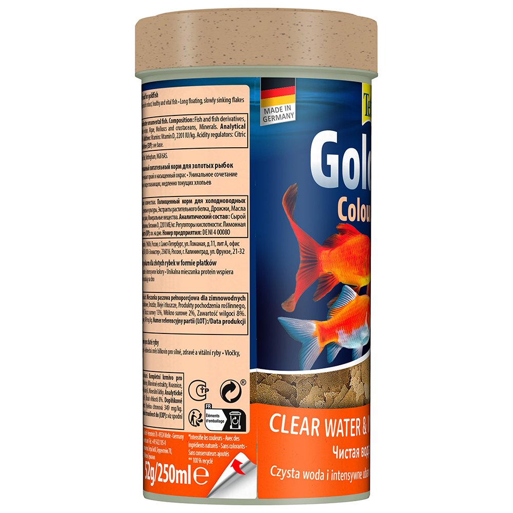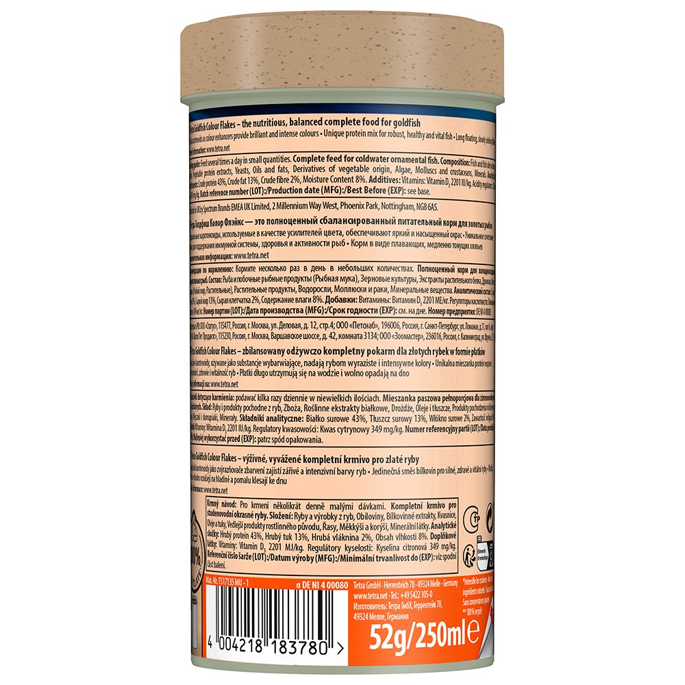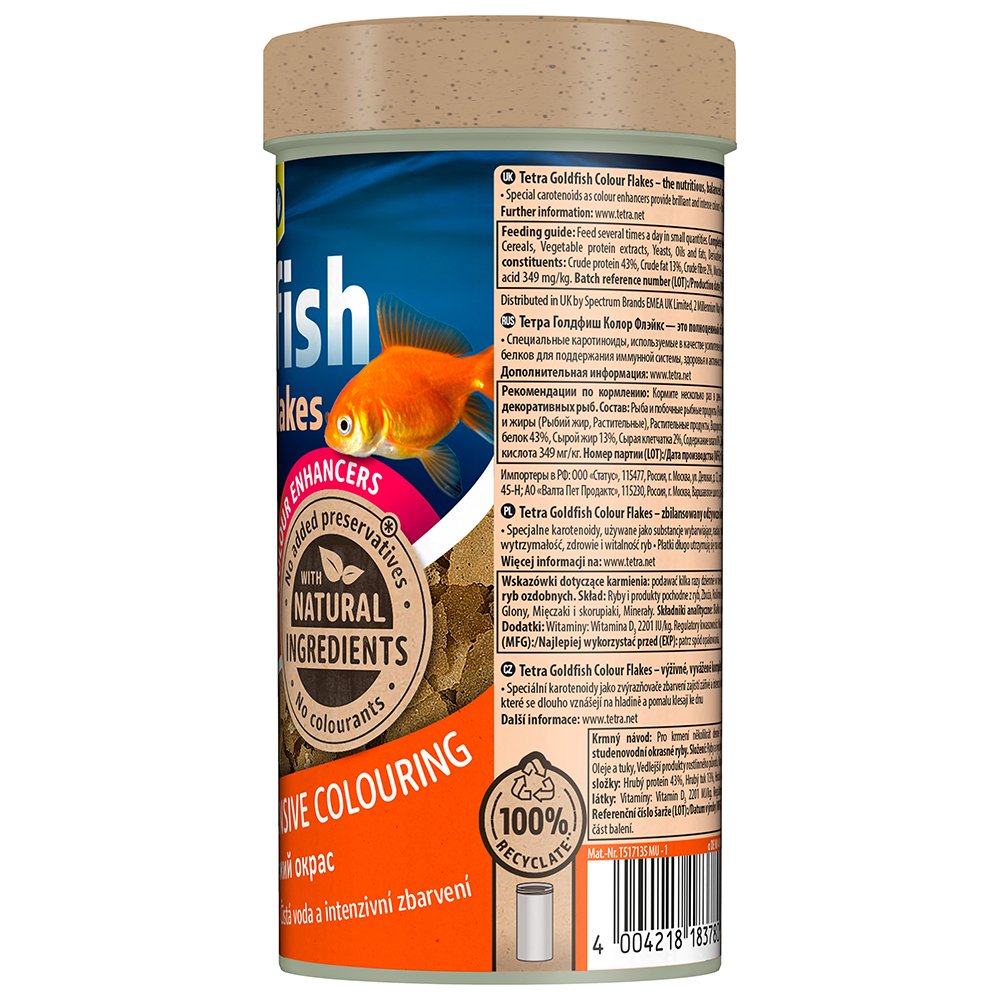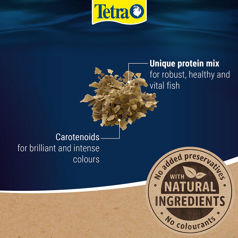 Tetra Goldfish Colour Flakes is a nutritious, balanced complete food for goldfish to enhance their natural colours. The optimal quality of the balanced diet supports the health and well-being of the fish. The food contains carotenoids as colour enhancers to ensure brilliant and intense colours. The long floating and slow-sinking flakes minimise waste and water pollution thanks to their high digestibility. The unique recipe, which is with high-quality natural ingredients, without colourants and added preservatives, and the optimally tailored protein-mix promote optimal growth, vitality and increased resilience. With Tetra Goldfish Colours Flakes, your goldfish will thrive, and your aquarium water will stay clean and clear.
