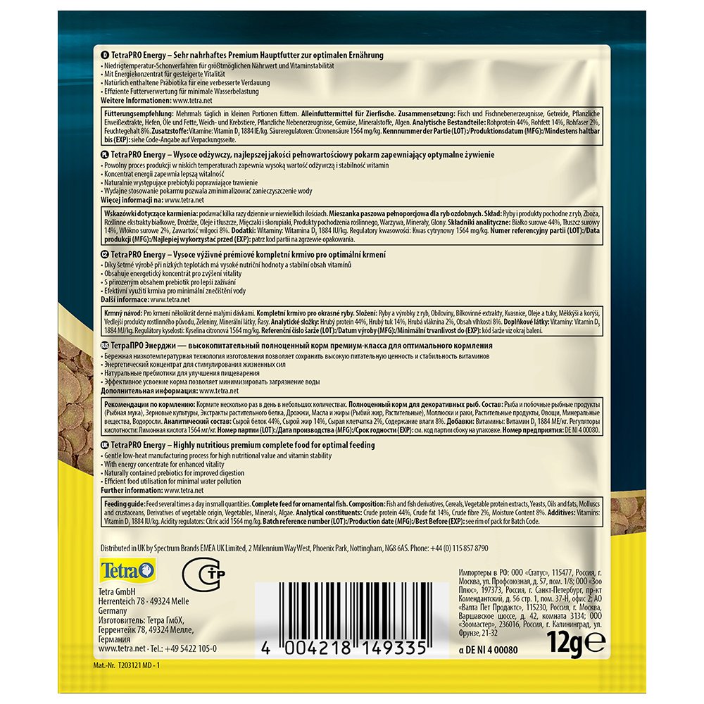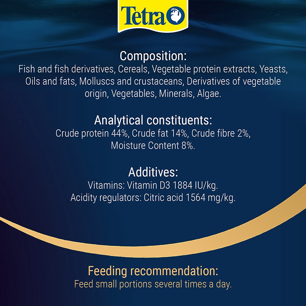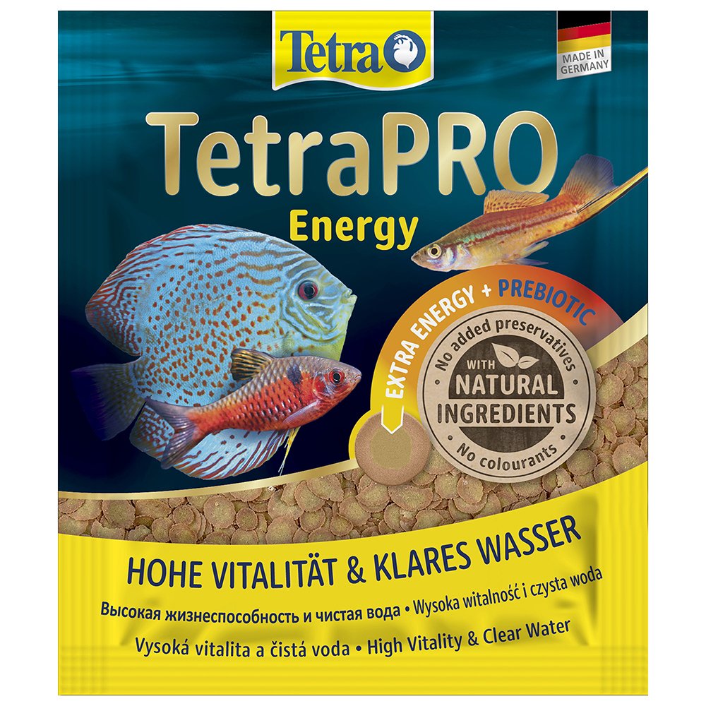 The range of TetraPRO has set a new standard in fish nutrition. The premium complete food is manufactured using a gentle, low-heat process. This special method gives TetraPRO Energy a very high nutritional value and vitamin stability. The energy concentrate in the multi-crisps contains krill meal to support fish vitality. The two-coloured multi-crisps also absorb less water than normal flake food to increase the nutrient content per volume. TetraPRO Energy offers an optimised protein-fat ratio. This ensures that the fish can use the protein specifically to build muscle by providing plenty of essential fatty acids for energy generation. Tetra’s multi-crisps also crumble much less than conventional flakes, significantly reducing the amount of food dust in the tins. Furthermore, the naturally contained prebiotics specifically support growth and the metabolism of health-promoting bacteria in the intestinal tract of fish. Thanks to their palatability and high digestibility, the multi-crisps keep the water in the aquarium clean. TetraPRO Energy is formulated with high-quality ingredients and without colourants or added preservatives.